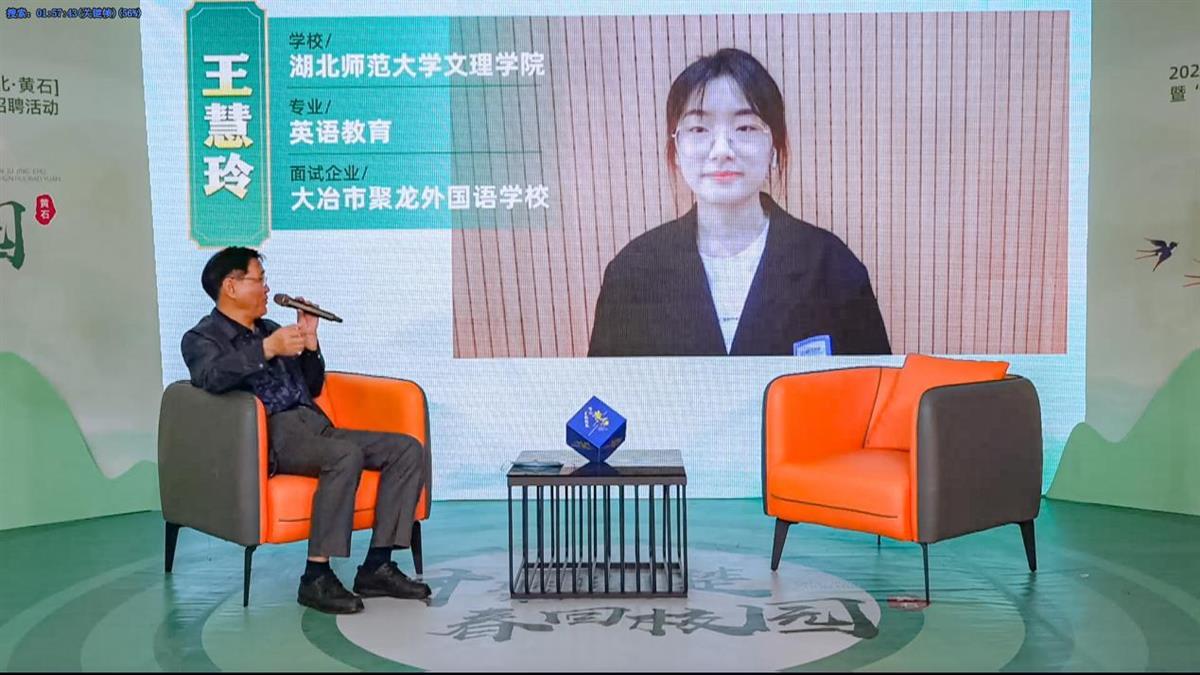 为增加直播招聘活动的实效性,助力黄石重点企业“八校揽才”,本次直播设计制作了简历投递小程序,方便高校毕业生投送简历。黄石市人才中心设计了八校联动“云上面试”环节,邀请黄石市重点企业负责人运用5G技术现场“云面试”。来自湖北师范大学文理学院的毕业生李佩娟,应聘岗位是大冶市聚龙外国语学校英语教育岗位,她通过视频连线的方式用流利的英语向聚龙高中相关负责人介绍了自己的情况,“云面试”后,李佩娟与大冶聚龙初步达成就业意向,并在线上签订了就业意向书。