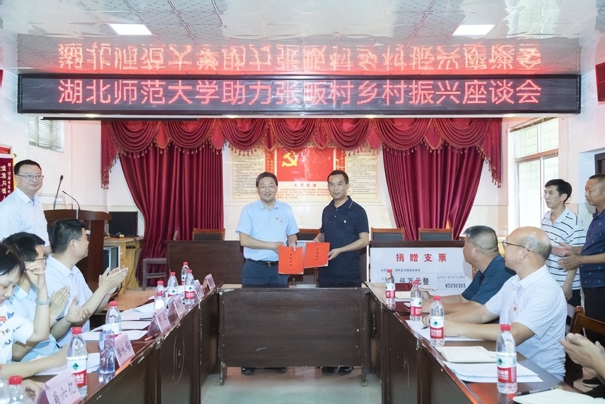 活动现场,湖北师范大学纪委书记陆咏梅、湖北师范大学党委常委肖六亿代表学校向阳新县张畈村捐赠了5万元乡村振兴资金。