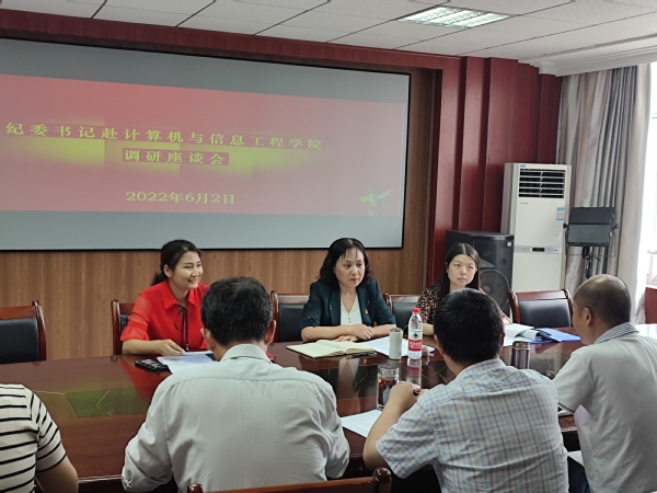 调研座谈会上,陆咏梅听取了计算机与信息工程学院领导班子成员关于学院近年发展情况汇报,详细了解了学院科学研究、人才培养、社会服务、师资队伍、实验室建设和学生管理等方面存在的困难和问题,同时跟与会人员开展了深入交流,并针对老师同学们提出的困难需求等予以解答并寻求解决方案。