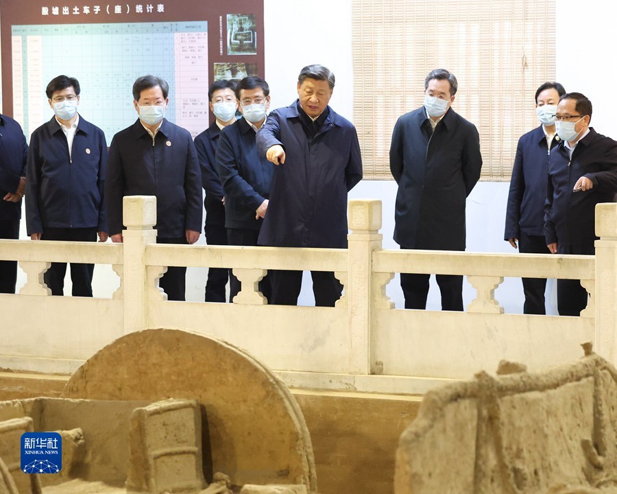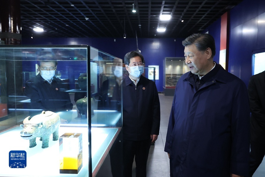 28日下午,习近平考察了位于安阳市西北郊洹河南北两岸的殷墟遗址。殷墟是我国历史上第一个文献可考、为考古发掘所证实的商代晚期都城遗址。习近平步入殷墟博物馆,仔细观摩青铜器、玉器、甲骨文等出土文物。随后,习近平来到车马坑展厅,察看商代畜力车实物标本和道路遗迹。他指出,殷墟出土的甲骨文为我们保存3000年前的文字,把中国信史向上推进了约1000年。殷墟我向往已久,这次来是想更深地学习理解中华文明,古为今用,为更好建设中华民族现代文明提供借鉴。中国的汉文字非常了不起,中华民族的形成和发展离不开汉文字的维系。在这方面,考古事业居功至伟。考古工作要继续重视和加强,继续深化中华文明探源工程。中华文明源远流长,从未中断,塑造了我们伟大的民族,这个民族还会伟大下去的。要通过文物发掘、研究保护工作,更好地传承优秀传统文化。习近平强调,中华优秀传统文化是我们党创新理论的“根”,我们推进马克思主义中国化时代化的根本途径是“两个结合”。我们要坚定文化自信,增强做中国人的自信心和自豪感。