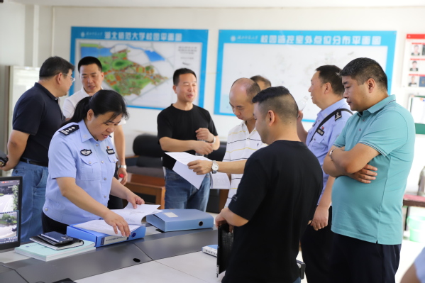 本网讯 (摄影 谢道楷)7月5日上午,黄石市反恐工作组吴时干组长一行来校,对我校反恐防暴工作进行实地检查。先后检查了保卫大楼视频监控中心、学工部少数民族学生活动室场所。区政法委副书记吴国胜、区公安分局副局长吴春燕陪同检查。