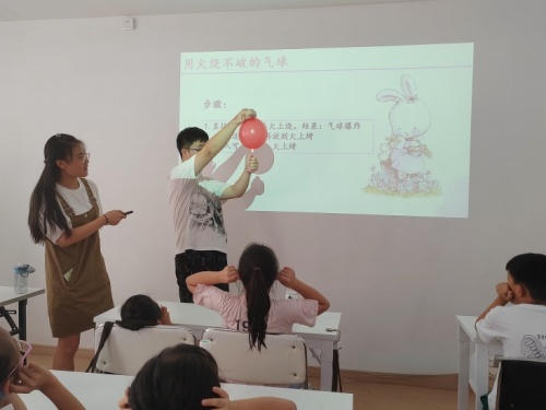 在学业辅导之余,实践队穿插开设系列科普兴趣课,充分发挥理化生专业优势,设计开发探究型、趣味型、互动型青少年科普课程,通过演示实验、观看视频以及趣味动手实验等方式,让原本晦涩深奥的科学知识变得浅显易懂,激发学生对科学的求知欲和探索欲。