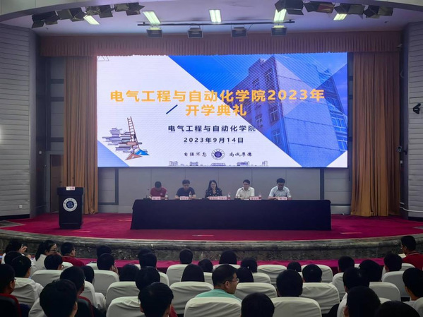 开学典礼上。陈兮宣读了《电气工程与自动化学院关于2023级班主任以及学生班主任选聘的决定》。王雪莲同学作为新生代表发言,表达了对大学生活的憧憬。詹汉彬、潘娇分别作为在校本科生、研究生代表发言,分享了各自参加专业竞赛、学术研究的心得体会。程伶俐博士作为教师代表发言,分享了她的求学经历和人生经验,鼓励新生奋勇争先、自信自强。