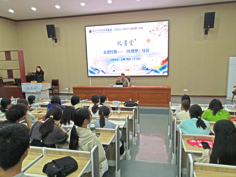本网讯 为扎实推进“书香致远·典亮师大”阅读推广活动,10月12日下午,图书馆在艺术设计大楼报告厅2J01举行以“走进红楼——《红楼梦》导读”为主题的第二期“悦書堂”活动。中国《水浒》学会会长、我校文学院教授、湖北大学客座教授石麟为师生们深度解读了四大名著之一的《红楼梦》。图书馆相关负责人,来自各学院的师生红迷以及传统文化爱好者参加活动。