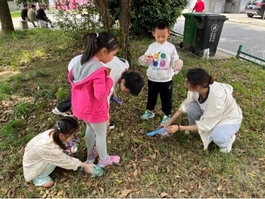 5月7日上午,金龟子幼儿园的小朋友早早就来到覆盆山社区口袋公园参加活动。活动现场,大学生志愿者们首先为小朋友介绍垃圾的分类,将四类垃圾桶拿到现场向小朋友当面展示,生动讲解各类垃圾的正确投放流程,指导小朋友识别四类垃圾标识。告诉他们垃圾分类从我做起。最后带领小朋友在草坪内玩“寻宝藏”游戏,小朋友要把对应“宝藏”放置在藏宝箱内,大家纷纷在地上拾起宝藏。弯腰捡拾垃圾这一小小的举动,在孩子们心中,播撒下一颗颗热爱劳动和保护环境的种子,培养了勤劳、朴实的好品质。
