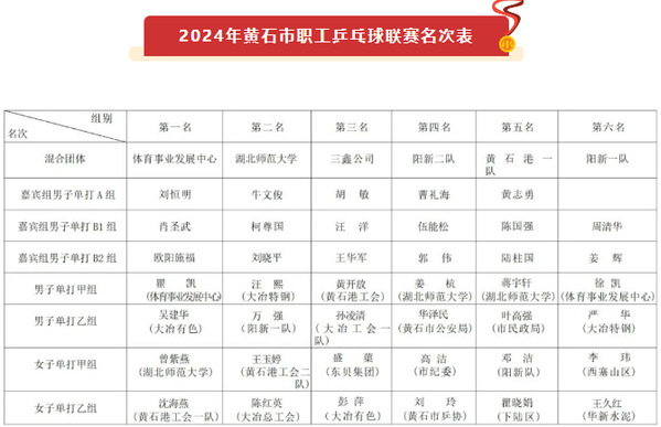 本网讯 5月24至25日,由黄石市总工会主办的“2024年黄石市职工乒乓球联赛”在黄石国家乒乓球训练基地隆重举行。我校教职工代表队勇夺混合团体亚军,曾紫艳获女子单打第一名,姜杭、蒋宇轩分获男子单打第四名、第五名,混合团体创我校代表队参加省市乒乓球比赛历史最好成绩。