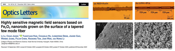 论文信息:李丽, 江超*, 韩园园, 胡传菊, 邓龙凤, 高嘉伟, 蒋文博, 陈福林, 谭海东, 温建, 李宏. Highly sensitive magnetic field sensor based on Fe2O3 nanorods grown on the surface of tapered few mode fiber. Optics Letters,vol. 48, no. 23, December 2023, 6240-6243.