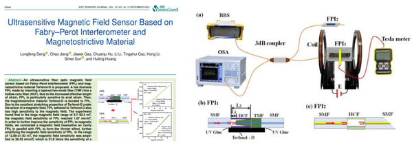 论文信息:邓龙凤, 江超*, 高嘉伟, 胡传菊, 李丽, 曹庭水, 李宏, 孙四梅, 黄会玲. Ultrasensitive Magnetic Field Sensor Based on Fabry–Perot Interferometer and Magnetostrictive Material. IEEE Sensors Journal, vol. 23, no. 24, 15 December 2023, 30444-30450.