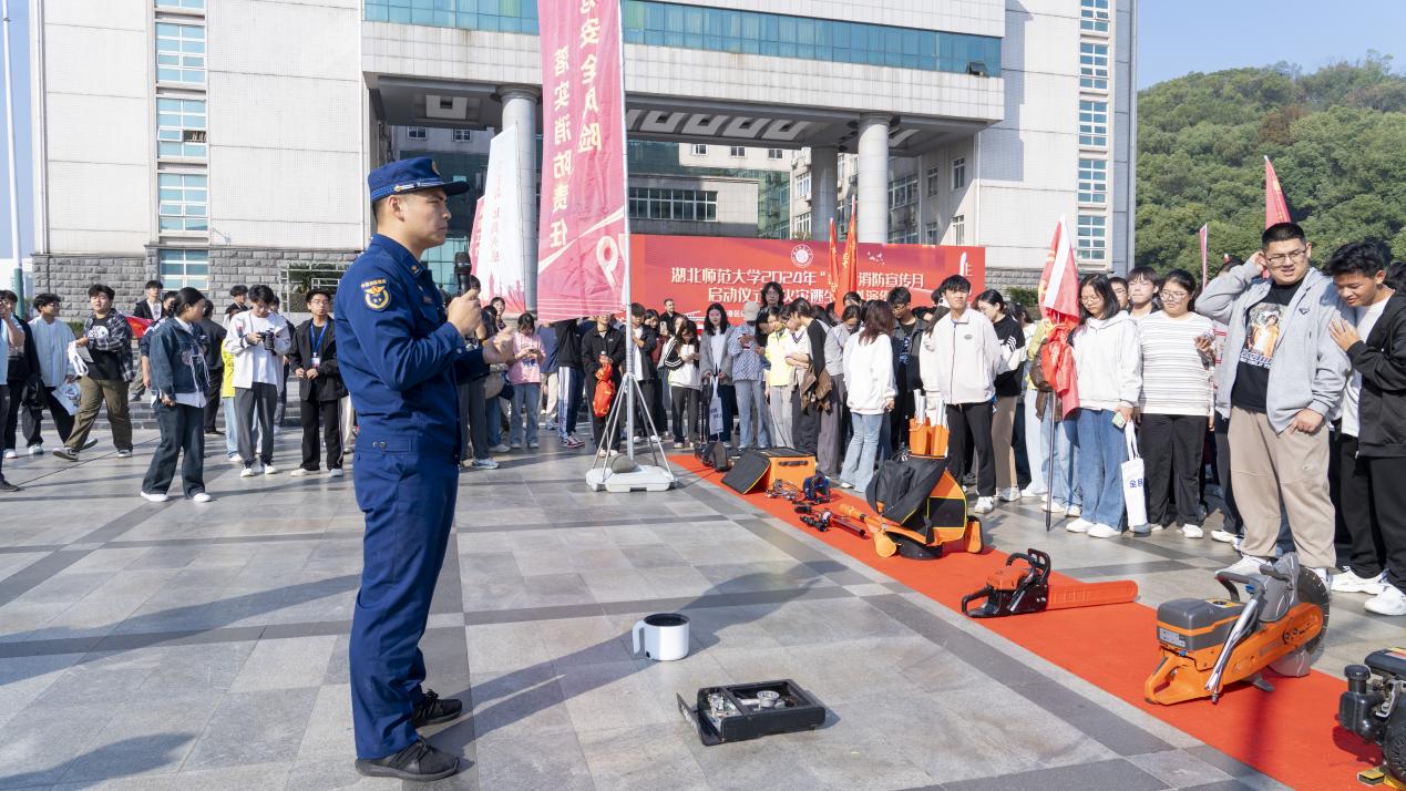 本网讯 为增强广大师生消防安全意识和应急逃生能力,11月10日上午,学校联合黄石港区消防救援局、黄石港公安分局举办2024年“119”消防宣传月启动仪式暨火灾逃生模拟演练活动。学校党政办、宣传部、学工处、团委、保卫处、国资处、基建处、后勤管理中心、湖北湖师教育科技发展有限公司相关负责人以及辅导员、2024级学生干部和寝室长代表参加此次活动。活动由保卫处副处长王浩主持。