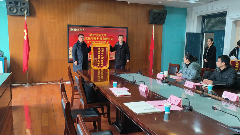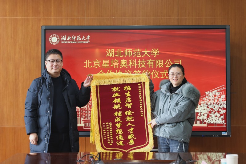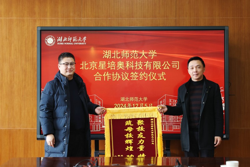 在双方代表的见证下,我校与北京星培奥科技有限公司签署了《产学研合作协议书》。签约仪式后,孙宏总经理代表北京星培奥科技有限公司向湖北师范大学科发院、招就处、校友工作处和计信学院等四家单位授旗。