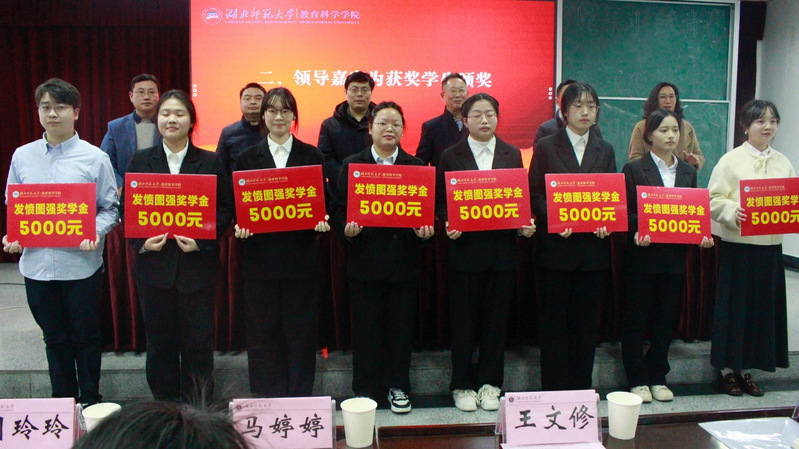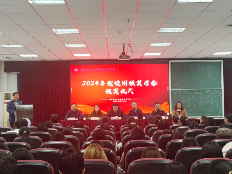 本网讯 为表彰优秀学生,鼓励学生发愤图强、积极向上。12月12日下午,我校教育科学学院在信息大楼报告厅举办了“2024年发愤图强奖学金”颁奖仪式。教育科学学院涂艳国院长,校友工作处处长刘洋,学工部(处)副部(处)长熊英,教育科学学院党委书记杨志丹,副院长崔波,副院长张小菊,班主任代表,学工办全体成员出席仪式,获奖学生与24级部分新生参与仪式。仪式由教育科学学院党委副书记刘广兵主持。