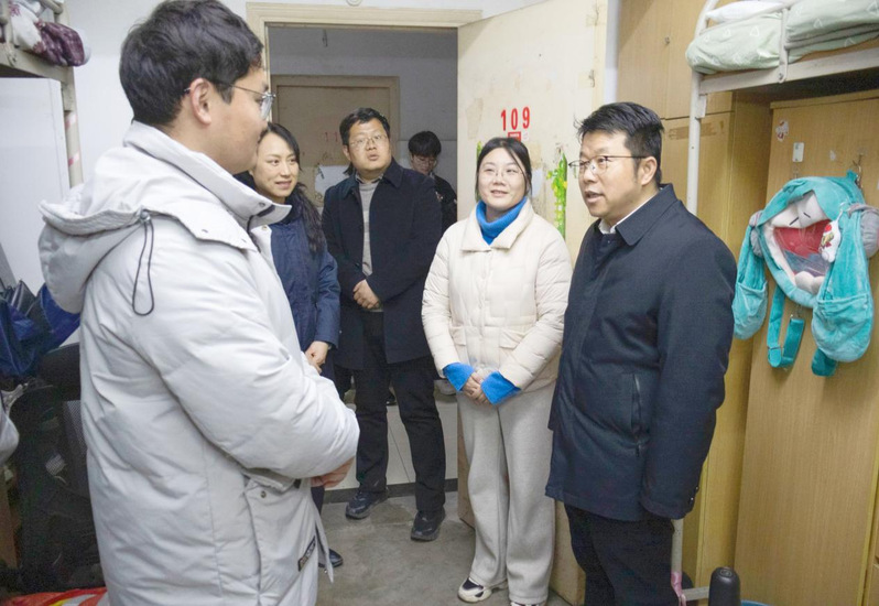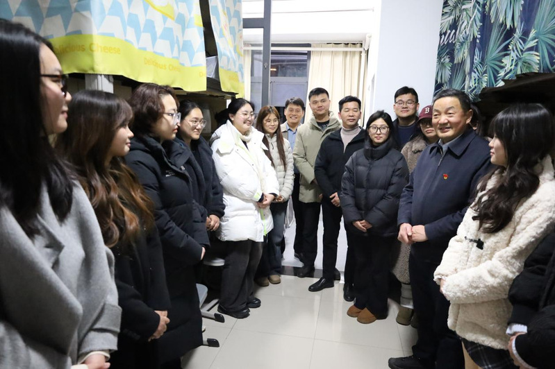 本网讯 2月16日晚,校党委书记李宏、校长雷儒金带领校领导班子成员深入“一站式”学生社区,走访慰问寒假返校学子。学工部等职能部门领导、各学院主要负责人、辅导员、班主任遍访学生宿舍,开展走访活动。