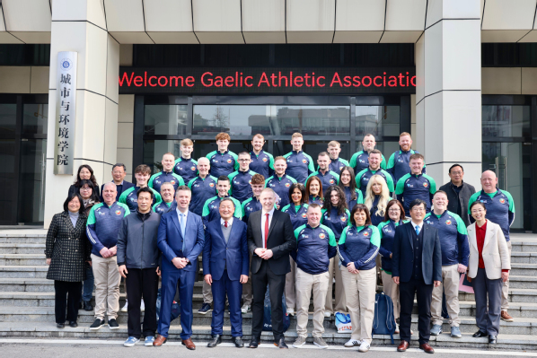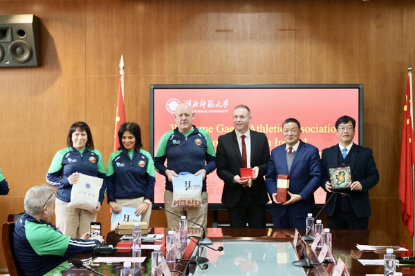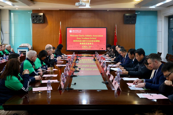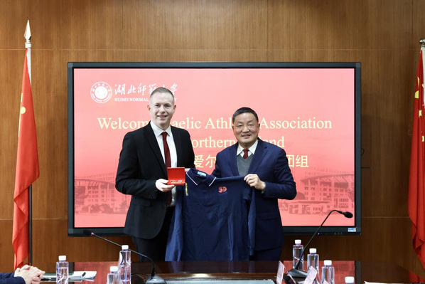 欢迎仪式上,双方互赠纪念品并合影留念。此次爱尔兰盖尔运动协会代表团的访问行程丰富多彩。在黄期间,代表团将参观我校体育学院、黄石康桥未来高级中学和黄石一中,与学生深入开展体育文化交流。后期代表团将访问武汉和北京,进一步感受中国的历史文化和现代发展。此次访问不仅促进了中爱两国在体育领域的交流与合作,也为双方的文化交流搭建了桥梁。(摄影学通社廖企杰、余佳鑫)