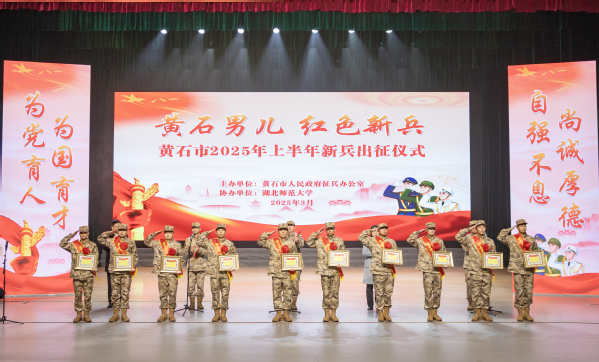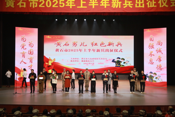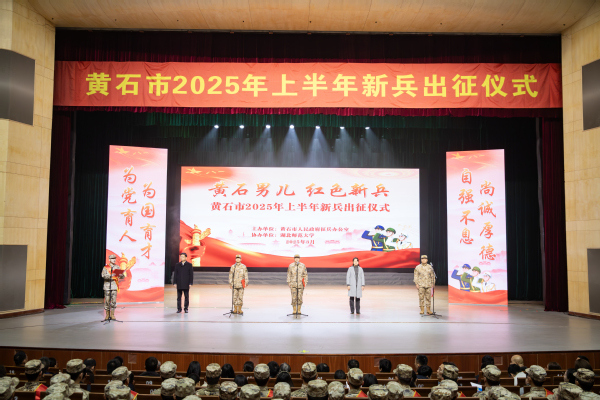 本网讯 3月14日上午,“黄石男儿,红色新兵”——黄石市2025年上半年新兵出征仪式在我校水上莲花大剧院举行。此次活动由黄石市人民政府征兵办公室主办,湖北师范大学协办。市征兵和民兵工作领导⼩组常务副组长、市委常委、黄石军分区大校司令员贾宇峰,市征兵和民兵工作领导小组副组长、市政府副市长徐丹娅,黄石军分区大校政治委员董相奎,市征兵办副主任、黄石军分区动员处处长王震、市退役军人事务局局长张襄兵,在黄高校相关负责人,我校党委书记李宏,党委常委、副校长余涛,各职能部门负责人,各学院师生代表,全体预定新兵及新兵家长参与仪式。出征仪式由王震主持。