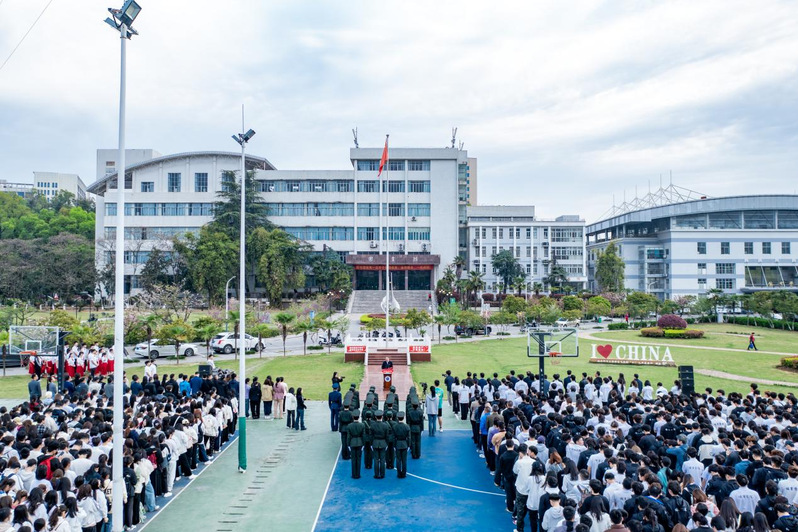 6时50分,伴着旭日晨光,国旗班迈着整齐坚定的步伐护送国旗走向升旗台。在雄壮的国歌声中,五星红旗冉冉升起,现场全体师生高唱国歌、行注目礼,深情表达着对伟大祖国的热爱和对母校生日的祝福。