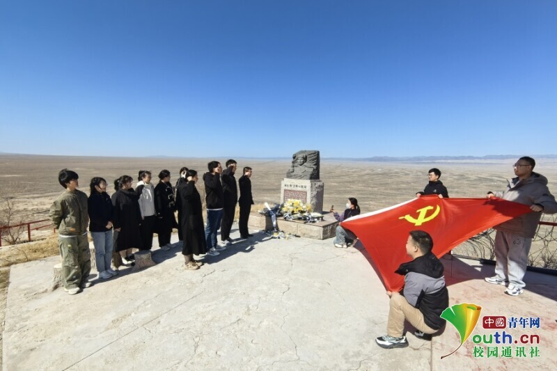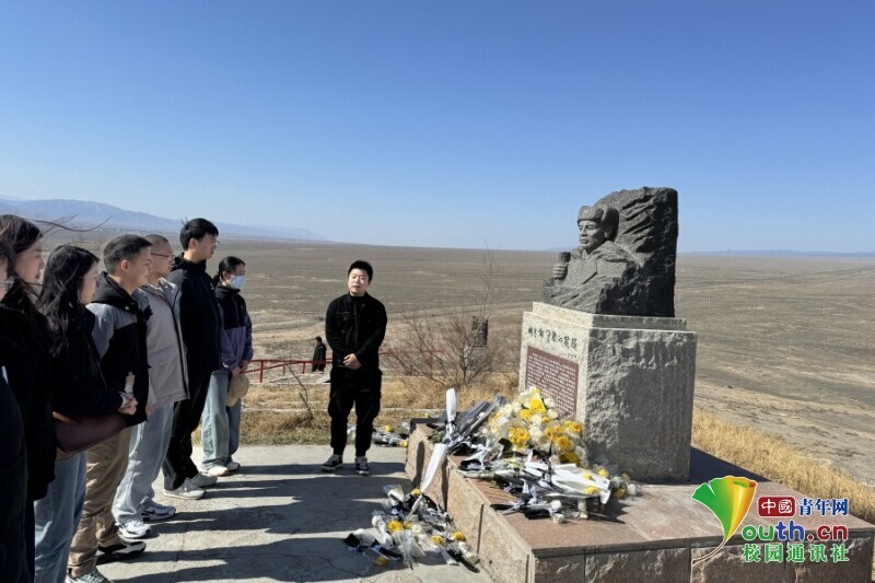 图为全体实习队员们赶赴阿拉山口市英雄山,开展“祭英烈”红色教育活动,实习队长杜家宇向队员们讲解阿拉山口边防连第一任主官吴光胜站长的故事。罗辰汐语 供图