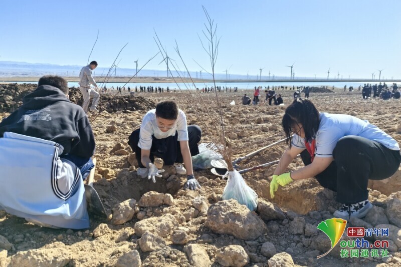 图为实习队员们协助学校老师们一起,带领八年级的学生们到阿拉山口市“8字湖”旁的一处戈壁滩开展植树活动。杜家宇 供图