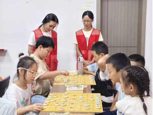 队员钱海枫、杨涵指导孩子们下象棋 胡佳欣 供图