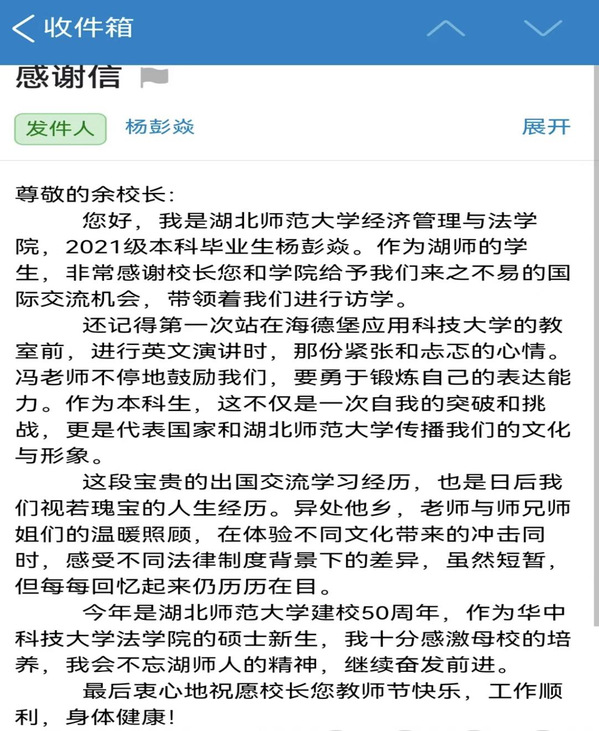 “我会不忘湖师人的精神,继续奋发前进!”2023年9月10日早上,副校长余翔像往常一样打开工作邮箱,一封命名为“感谢信”的邮件引起了他的注意。这是经济管理与法学院1702班法学专业的本科生杨彭焱发过来的节日祝福。在信中,深情表达了对母校的培养和余翔老师的教育恩情的感激,句句肺腑,至真至情。