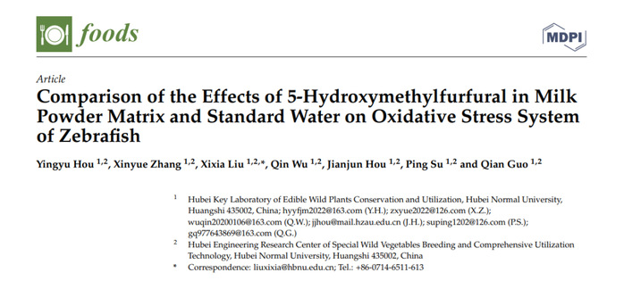 近日,食用野生植物保育与利用湖北省重点实验室刘细霞副教授课题组在5-HMF对斑马鱼氧化应激系统影响的研究中取得新进展,相关成果以“Comparison of the Effects of 5-Hydroxymethylfurfural in Milk Powder Matrix and Standard Water on Oxidative Stress System of Zebrafish”为题,发表在期刊:FoodsJCR分区Q1, IF5.561)杂志上。第一作者侯莹钰为湖2021级硕士研究生,通讯作者刘细霞。