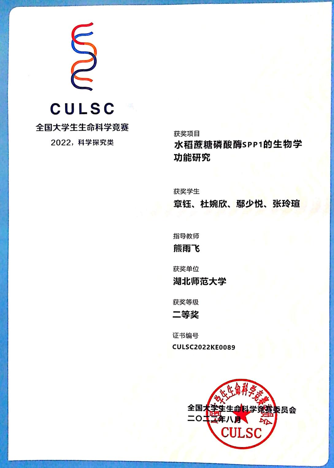 2022年8月,全国大学生生命科学竞赛(2022,科学探究类)决赛结果已经公示。我院熊雨飞博士指导的《水稻蔗糖磷酸酶SPP1的生物学功能研究》(团队成员:章钰、杜婉欣、鄢少悦、张玲瑄)荣获科学探究类二等奖,特此祝贺。(邵海晨 供稿)