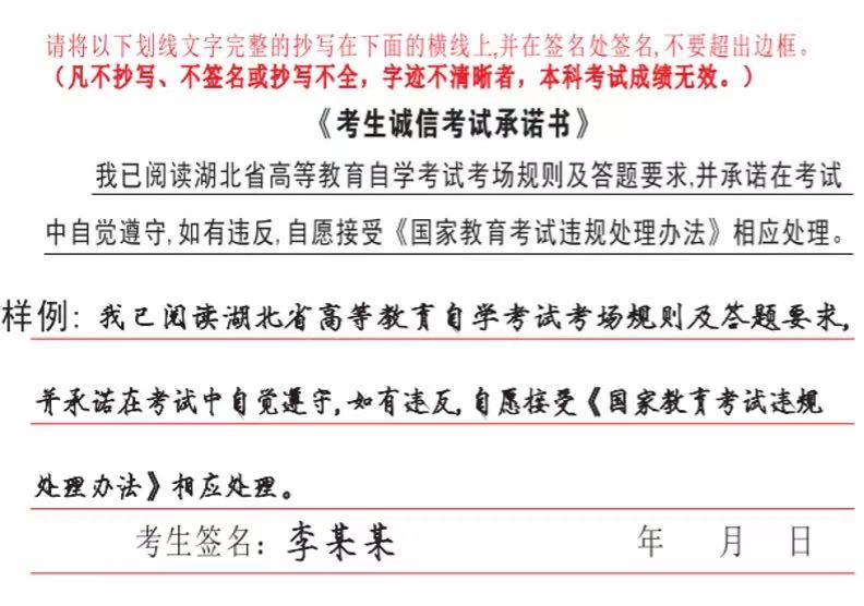 所有考生一律禁止携带手机等任何电子通讯设备进入考点(以智能安检门为界),否则视为严重舞弊,取消本次所有考试科目成绩并移交有关部门进一步处理;考试期间凡发现夹带等作弊行为,经查实取消本次所有考试科目成绩。*考生应在答题卡指定区域完整抄写《考生诚信考试承诺书》(抄写样例如下图),凡不抄写、不签名或抄写不全,字迹不清晰者,该科考试成绩无效。毕业时省教育考试院将对每张答题卡上的《考生诚信考试承诺书》笔迹进行复核,凡笔迹不一致、经鉴定为代考的,将根据《国家教育考试违规处理办法》作出成绩作废、延迟毕业、记入国家教育考试诚信档案等处理。