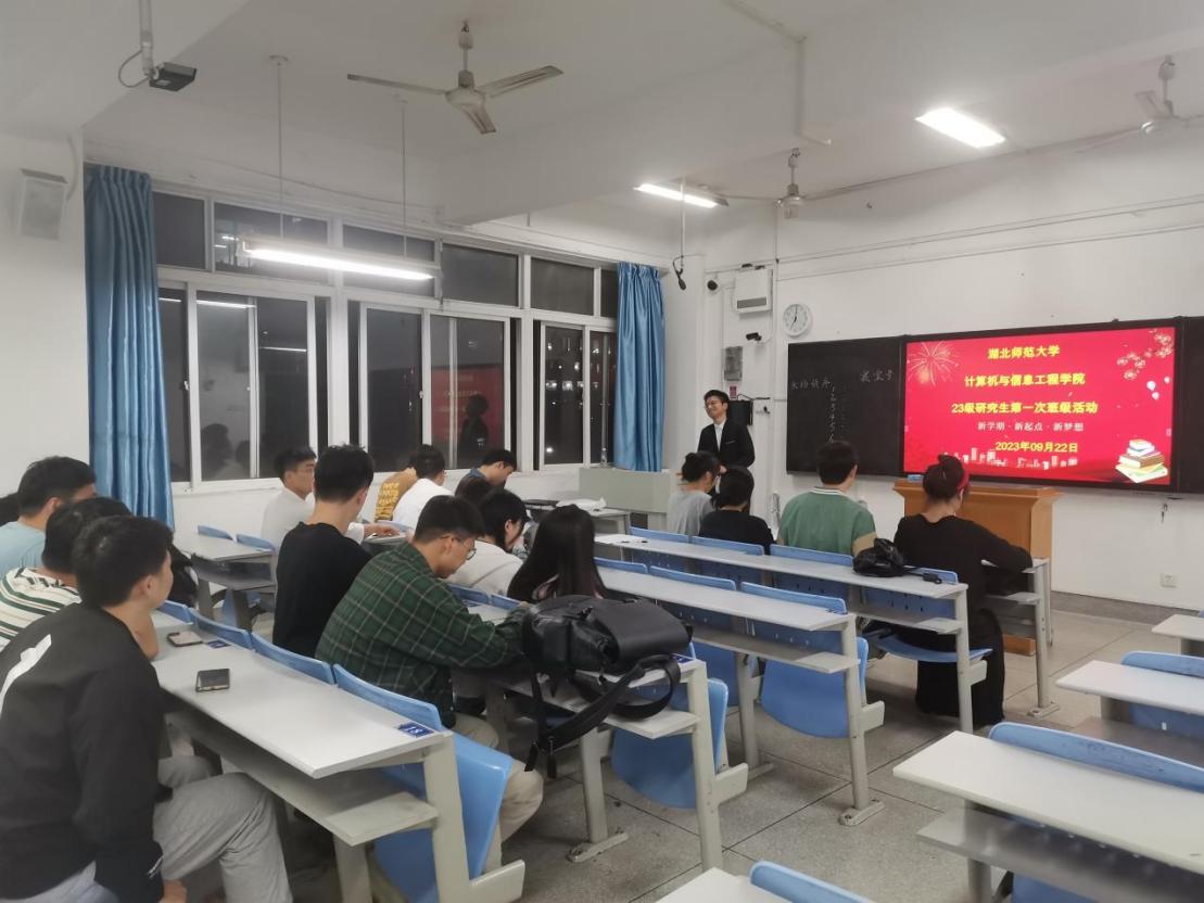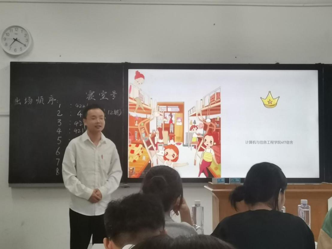 (通讯员 曾鑫)为了营造良好的宿舍文化氛围,响应学校创建文明宿舍的号召,计算机与信息工程学院2023级研究生班级于2023年9月22日19时于教育大楼1208教室举办了以“喜迎校庆五十载,宿舍文化展风采”为主题的寝室PPT风采展活动。学院21级研究生汪琛玉、叶伊,22级研究生周霞、邓贵斌应邀担任评委,2023级研究生班级全体同学参加活动。23级研究生班级组织委员朱涛主持活动。