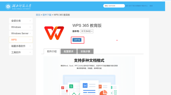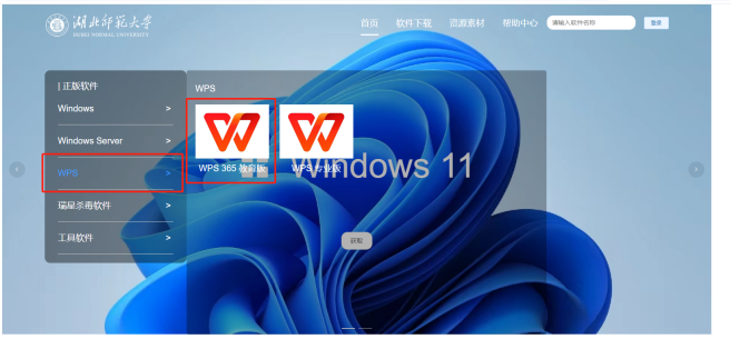 点击此链接https://ms.hbnu.edu.cn打开湖北师范大学软件资源服务平台(仅在校园网下或链接校内vpn情况可访问),在软件栏目中下载定制WPS 365教育版。