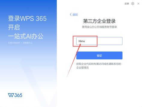 打开WPS 365客户端点击右上角“立即登录”,登录方式选择“专属账号”,如未出现“专属账号”登录方式,点击其他登录方式选择“第三方企业码”,输入机构代码“hbnu”,跳转到本校的统一身份认证系统界面。