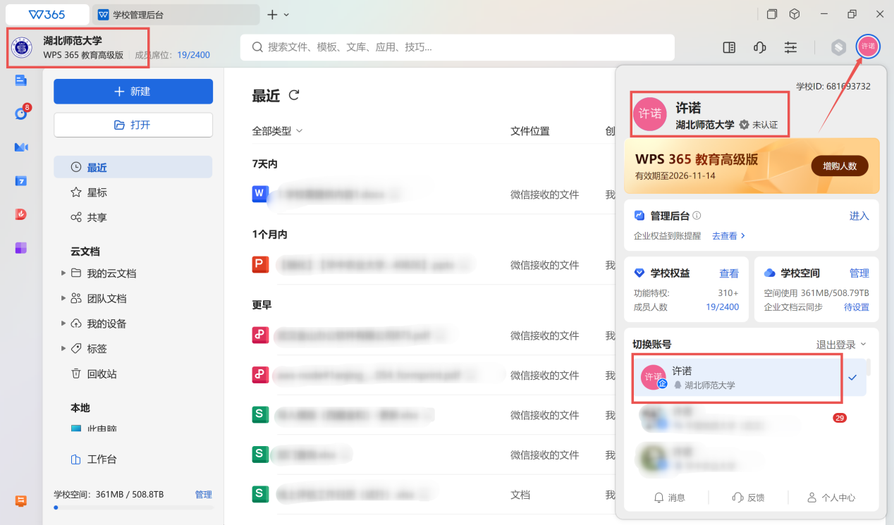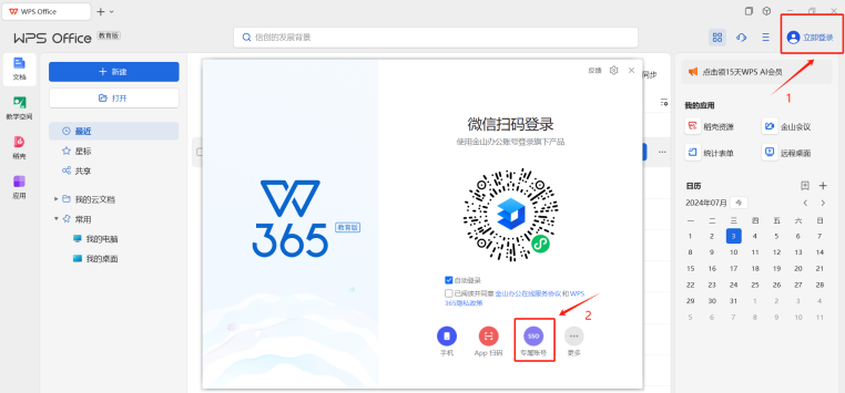 Windows电脑也可以使用个人版WPS,按照下面步骤激活WPS 365的流程登录我校账号使用。