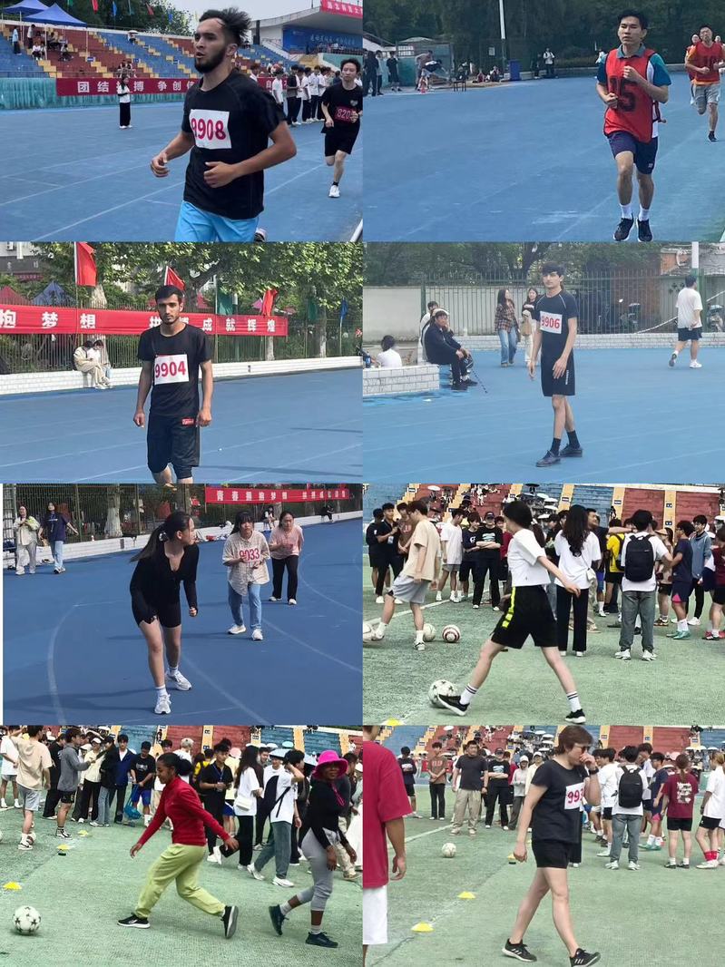 蓝色的跑道与绿色的草坪相映成趣,观众席上彩旗飘扬,热闹非凡。在各项比赛中,留学生运动员们充分展现了他们的运动实力和竞技水平。无论是百米冲刺的速度与激情,还是跳远比赛的技巧与力量,他们都全力以赴,勇争第一。他们的精彩表现不仅赢得了观众的阵阵掌声,也为国际教育学院争得了荣誉。来自摩洛哥的小丁同学经过激烈的角逐,最终以优异的成绩获得了男子100米甲组短跑比赛第三名。