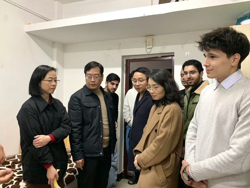 12月6日晚7时,为深入了解留学生学习、生活情况,国际教育学院院长龚波带领全体班子成员深入留学生宿舍进行探访,及时发现、解决问题。兼职辅导员、留学生楼栋阿姨、留学生楼栋管理员一起参加了此次走访活动。