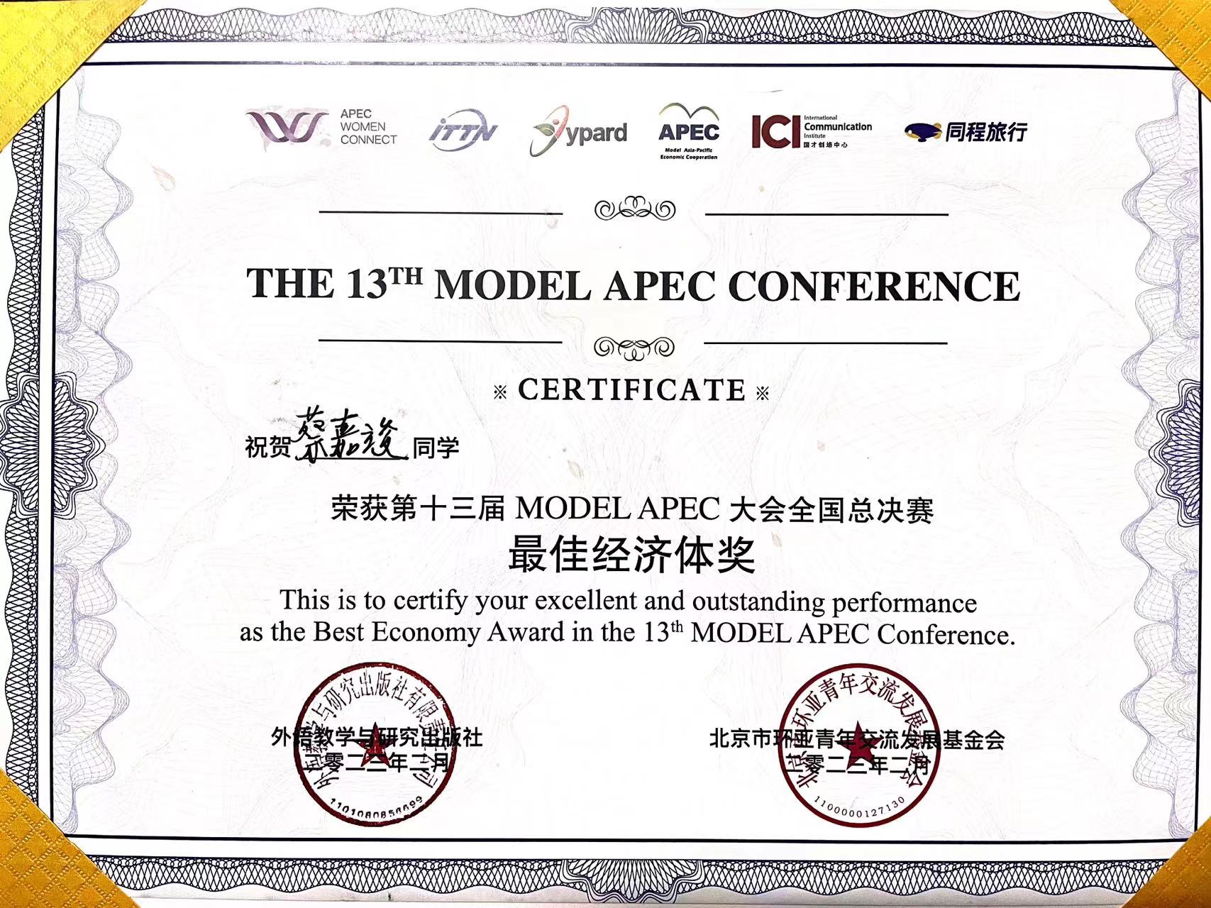 2023211日,由太平洋经济合作全国委员会、中国农业科学院海外农业研究中心、中国教育科学研究院国际与比较教育研究所、APEC Women Connect、国际技术转移协作网络指导,北京市环亚青年交流发展基金会、外研社国才创培中心、全球农业发展青年论坛主办,同程旅行、西交利物浦大学支持的第十三届亚太青年模拟APEC大会(以下简称MODEL APEC)全国总决赛在苏州顺利闭幕。通过模拟APEC会议的形式,Youth Vision for SDGs”的框架下,探讨在农业、数字经济、科技创新、教育与女性主题下合作的可能性,为亚太地区的青年发展贡献自己的力量。
