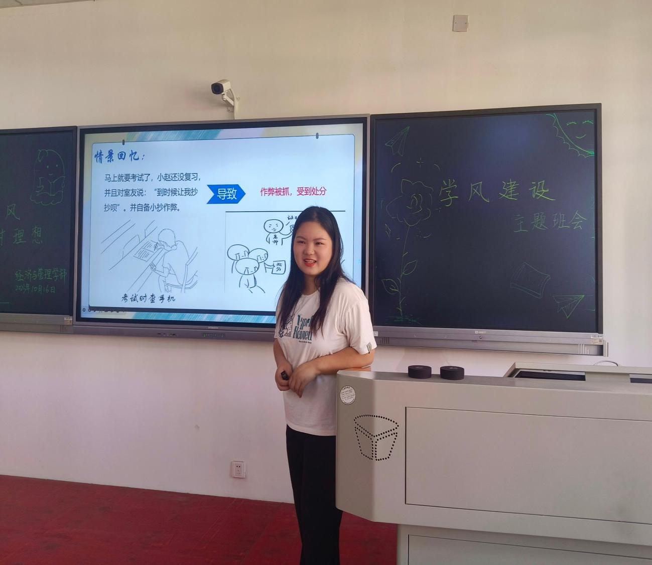 10月16日上午10:00,经管学部辅导员吕彩云老师在2-402召开“找差距 正学风 树理想”学风建设主题示范班会,各学部辅导员老师莅临观摩指导。吕彩云老师从不良学风现状、不良学风归因分析、学风建设举措、朋辈分享等方面开展班会,勉励同学们做好大学生涯规划并付诸努力,班会结束之际,吕彩云老师着重提醒同学们提高警惕,防范电信诈骗,强调共青团员不得信仰宗教。同时,提醒大家遵守学校管理规定,不得使用大功率电器,不得饲养宠物。